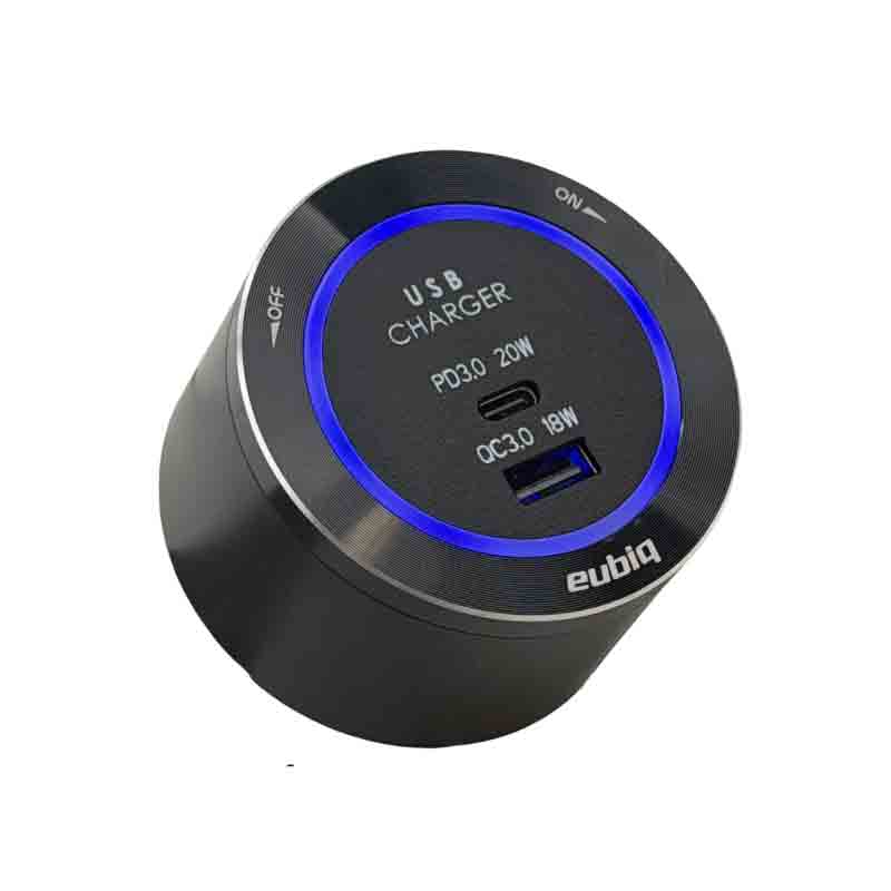 Eubiq fast charger with two USB ports (USB-A and USB-C)
